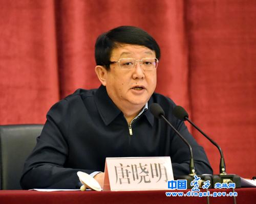 戴超出席会议并讲话。 唐晓明说,我们一定把强化党性锤炼作为立身之本,牢固树立政治意识、大局意识、核心意识和看齐意识,在思想上政治上行动上始终同以习近平总书记为核心的党中央保持高度一致,全面贯彻落实习近平总书记系列重要讲话精神和视察甘肃时的“八个着力”重要指示精神,确保党的路线、方针、政策得到最坚决有力地贯彻和执行。我们一定把推动经济发展作为首要任务,认真贯彻落实五大发展理念,坚持稳中求进工作总基调,不断深化供给侧结构性改革,紧盯特色优势产业转型升级、战略性新兴产业发展壮大,努力做大做强县域经济,坚决打赢脱贫攻坚战,确保与全省全国同步建成全面小康社会。我们一定把为民造福谋利作为最大追求,牢固树立以人民为中心的发展思想,在学有所教、劳有所得、病有所医、老有所养、住有所居上持续取得新进展,尽心竭力让定西人民的日子越过越红火。我们一定把坚守高标底线作为根本要求,严守党的政治纪律和政治规矩,认真落实民主集中制,坚持正确的选人用人导向,坚持总揽全局、协调各方、把好方向,大力弘扬源于定西、弥足珍贵的“三苦”精神,积极倡导“马上就办、真抓实干”的工作作风,努力营造风清气正、团结进取的发展环境。我们一定把全面从严治党作为第一职责,认真履行主体责任,全力推动“两学一做”学习教育常态化、制度化,始终保持惩治腐败的高压态势,筑牢法治“篱笆”、遏制权力“越线”,切实把权力关进制度的笼子里。我们坚信,有省委、省政府的坚强领导,有全市广大干部群众的真抓实干,有社会各界的鼎力支持,定西的发展一定能够持续开创新局面,打赢脱贫攻坚战、建成全面小康社会的目标一定能够如期实现。