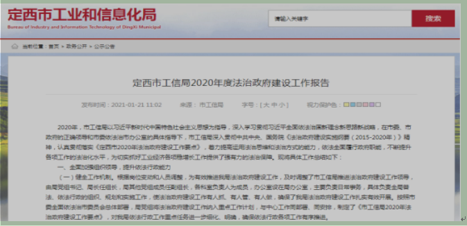 在市工信局门户网站公开2020年度法治政府建设工作报告 三是按照网站建设工作要求,对市工信局2020年度网站工作报表进行了公开;对市工信局权责清单进行了公开;