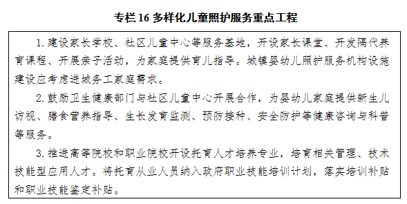 第五章 促进生活服务多层次多样化发展 生活服务是公共服务体系的重要组成部分,加快发展高品质多样化个性化生活服务,是满足人民群众美好生活需求的客观需要,也是扩大内需、构建强大国内市场的重要举措。 第一节 多样化儿童照护服务 引导社会力量举办多种类型的婴幼儿照护机构,提供更多专业化、个性化、精细化服务。督促指导现有托育机构规范发展,注重扶持和打造婴幼儿托育服务示范试点机构,创造有利条件,鼓励和引导民间资本投资托育服务行业。建设家长学校、社区儿童中心等服务基地,开设家长课堂、开发隔代养育课程、开展亲子活动,为家庭提供育儿指导。推进高等院校和职业院校开设托育人才培养专业,培育相关管理、技术技能型应用人才。