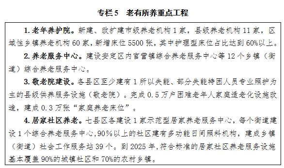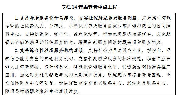 第五节 普惠养老服务 坚持政府投入为引导、民间资本投入为重点,打造公办养老机构保基本、社会办养老机构为主体,社会投资与政府投资相结合的机构养老新模式。充分利用已有场所、人员、设备、政策、项目等,建立健全多项目共融、多资源共用、多形式共建的深度合作机制,鼓励建设具有综合养护功能的区域性中心敬老院。推广形式多样的互助养老模式,形成覆盖城乡的养老服务网点,完善居家、社区、机构相协调的养老服务体系,养老服务质量持续改善,老年人及其子女获得感、幸福感、安全感显著提高。