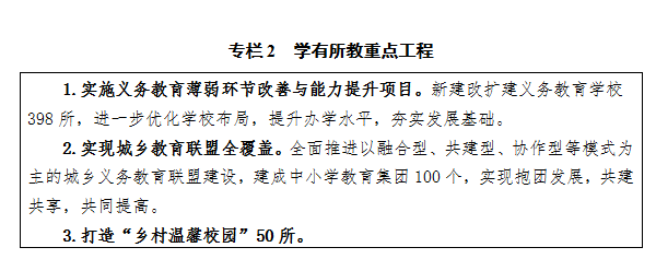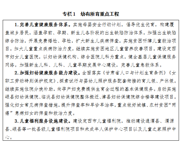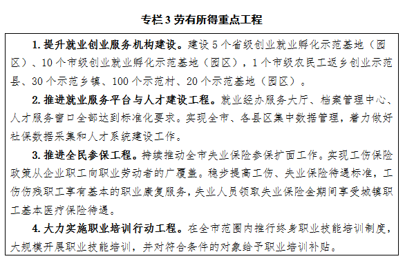 1.带*的为“十四五”期间累计数。 2.每万人接受公共文化设施服务次数中的公共文化设施包括公共图书馆、文化馆 (站)、美术馆、博物馆(纪念馆)和艺术演出场所。 3.人均体育场地面积:体育场地内可供开展训练、比赛和健身活动的有效面积与人口 的比值,以“平方米/人”表示。在计算某地人均体育场地面积时,所依据的人口数 量通常是指所辖区内常住人口数量。 4.新建城区、新建居住区配套建设养老服务设施达标率:按照《国务院关于加快发展 养老服务业的若干意见》规定,各地在制定城市总体规划、控制性详细规划时,必须按照人均用地不少于 0.1 平方米的标准,分区分级规划设置养老服务设施。凡新建城区和居住(小)区,要按标准要求配套建设养老服务设施。 5.城镇新增就业人数:报告期内本地区城镇累计新就业人员数与自然减员人数之差。 第三章 推进基本公共服务均等化 享有基本公共服务是公民的基本权利,保障人人享有基本公共服务是政府的重要职责。坚持以促进机会均等为核心,主动缩小城乡、区域、人群间的差距,推动实现全市公民都能公平可及地获得大致均等的基本公共服务。 第一节 幼有所育 为农村计划怀孕夫妇、城镇符合条件的孕产妇以及育龄夫妇免费提供孕前优生健康检查、孕早期健康检查、产后访视和基本避孕节育等服务。落实农村部分计划生育家庭奖励扶助和计划生育家庭特别扶助,改善病(产)房、新生儿室等诊疗环境和设施设备条件。为适龄儿童提供国家免疫规划疫苗接种和中医药健康管理服务。开展新生儿家庭访视,加强新生儿满月、婴幼儿和学龄前儿童健康管理以及提升儿童重大疾病、疑难复杂疾病诊治和急危重症诊疗服务能力。强化孤儿、艾滋病病毒感染儿童和事实无人抚养儿童基本生活保障。健全困境儿童基本生活、基本医疗、教育保障制度,落实抚养监护责任,完善法律援助机制。加强农村留守儿童关爱保护,提供心理关爱、行为矫治等服务。加快儿童福利机构、未成年人保护设施建设,逐步实现“养、治、教、康”一体化。 持续巩固拓展教育脱贫攻坚成果,加大项目、资金、师资、资源支持力度,办好乡村小规模学校和乡镇寄宿制学校,振兴乡村教育。继续实施“义务教育薄弱环节改善与能力提升项目”,持续优化城区义务教育布局,扩大学位供给,有效化解“大班额”问题。加快推进城乡义务教育联盟建设,逐步缩小城乡教育资源差距,实现城乡教育一体化发展。加大对随迁子女、留守儿童的教育关爱,保障享有公平而有质量的义务教育。 第三节 劳有所得 贯彻落实省级公共就业创业服务设施、设备配置、人员配置、服务规范指导性地方标准及实施标准。加快推动公共就业服务数字化转型,打造集政策解读推送、业务办理咨询于一体的线上智能服务、线下自助服务体系,提高公共就业服务信息化水平,推进各类就业信息共享开放。健全多层次社会保障体系,推进社保关系转移接续工作,推进失业保险、工伤保险向职业劳动者广覆盖,并实现省级统筹。逐步提高公共就业服务能力,加强职业技能培训,建立健全劳动者职业和创业培训制度,推动终身职业技能培训。加强劳动保障监察和争议调解仲裁,维护劳动者合法权益。
