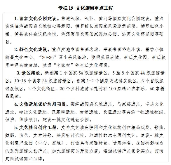 第四节 促进文化旅游融合发展 坚持以文塑旅、以旅彰文,深入推进华夏文明传承创新区建设,大力实施长城文化、长征文化、黄河文化、始祖文化、民俗文化等五大文化工程,建设一批塑造定西形象的重大文旅项目,推出一批体现定西特色和时代要求的文艺精品,渭水文化旅游节、马家窑文化节、书画艺术节、土豆音乐节、花儿原上乡村马拉松、长城之源山地自行车联赛等在全省和全国成为具有一定影响力的高品质文艺活动、体育赛事,使文体旅游成为展示定西城市形象的最佳窗口,“渭水源头·李氏故里·当归定西”的知名度、认同感更加提升,定西在国内外的美誉度和影响力明显扩大,初步建成“一带一路康养休闲目的地”。推动“一线、两廊、三地、N景区”建设,加快形成文化旅游新发展格局。