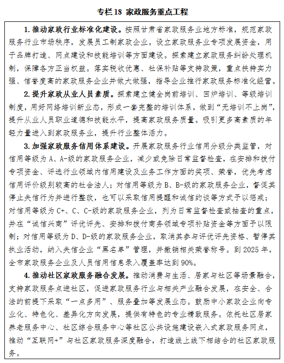 第三节 创新家政服务 政府主导,推动行业规范化标准化建设。加快推进家政服务行业规范化建设,规范行业准入,探索实行持证上岗,使家政市场参与者有法可依,切实维护家政企业、家政服务从业人员、消费者的合法权益。加大培训力度,提高家政服务人员质量,进一步提升从业人员职业道德和技能水平,提高家政服务质量。做好信用体系建设,完善家政企业和从业人员的信用记录,保障家政服务安全。优化供给结构,推动社区家政服务融合发展。以培育家政品牌和龙头企业为示范,带动家政服务行业提质扩容,为社区居民提供安全、便利、优质的家政服务,进而提升家政服务行业社会认可度及其劳动力价值定位。