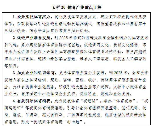 第五节 发展壮大体育产业 优化体育产业结构,大力拓展全民健身活动的广度和深度。积极培育冰雪、攀岩、漂流等具有消费引领特征的时尚运动项目,鼓励开发适合不同人群、不同地域特点的特色运动项目。努力培育和打造一批具有影响力的体育产业园区、体育培训基地和品牌赛事。完善金融、资讯、科研、中介等体育产业发展链条,构建体育产业服务体系。积极推进体育竞赛表演产业专业化、品牌化、融合化发展,建设具有较大影响力的体育竞赛表演产业集聚区,推出具有较大知名度的体育精品赛事,打造具有自主知识产权的体育竞赛表演品牌,培育一批具有较强市场竞争力的体育竞赛表演企业,使体育竞赛表演产业成为推动定西市经济社会持续发展的重要力量。推动体育用品制造业发展,以健身器材和竞赛表演器材制造为突破口,在全市培育一批具有一定规模的体育用品制造与销售企业。争取国内外知名体育品牌公司落户定西或设立分支机构,发展电子商务、连锁经营、加盟营销等新型业态,带动体育用品制造与销售业发展。