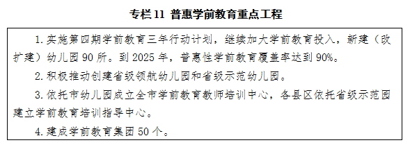 第二节 普惠学前教育 以争创国家学前教育普及普惠县(区)为契机,突出幼儿园日常保教规范和质量导向,改善办园条件,提升办园内涵,推动幼儿园晋等提标,建成一批省级领航幼儿园和省市级示范性幼儿园。建立完善普惠性幼儿园成本分担机制,制定并落实学前教育生均公用经费财政拨款标准,动态调整公办园和普惠性民办园收费标准,加强对非营利性民办幼儿园收费监管,遏制过高收费。推进普惠性幼儿园提质发展,扩大优质学前教育资源覆盖面,满足人民群众“入好园”的需求。