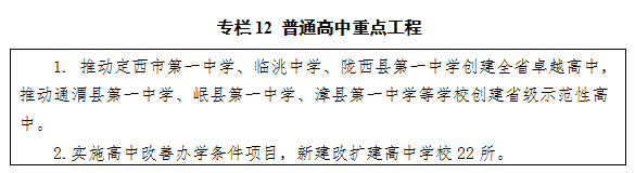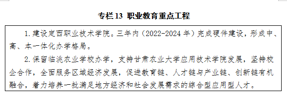第三节 普通高中建设 加强县域普通高中建设,实施县域普通高中发展提升计划,打造一批卓越高中和省级示范性高中。构建规范有序、科学高效的选课走班运行机制,建立和完善行政班与教学班并存的教育教学管理制度。积极推进高中新课程改革省级示范区、示范校创建,提高新课程实施质量。推进高中阶段职普协调发展,探索开展普通高中分类办学,形成一批涵盖科技、人文、体艺、综合等多个领域,有效满足学生多样化学习需求的特色普通高中学校。 第四节 职业教育发展 打造纵向贯通、横向融通的现代职业教育体系,深入推进职普融通,打通职业教育与普通教育横向“立交桥”,建立普通高中和中职学校合作机制。加快优质中等职业学校和优质专业建设,支持建设2-3所优质中等职业学校和10个省市级骨干专业(群)。发挥中医药产业优势,打造“康养定西”中医药专业群。聚焦“技能甘肃”目标任务,推进校企合作、产教融合贯穿于人才培养全过程。积极推行“1+X”(学历证书+职业技能等级证书)证书制度,加强工匠精神培育,强化实践性教学。