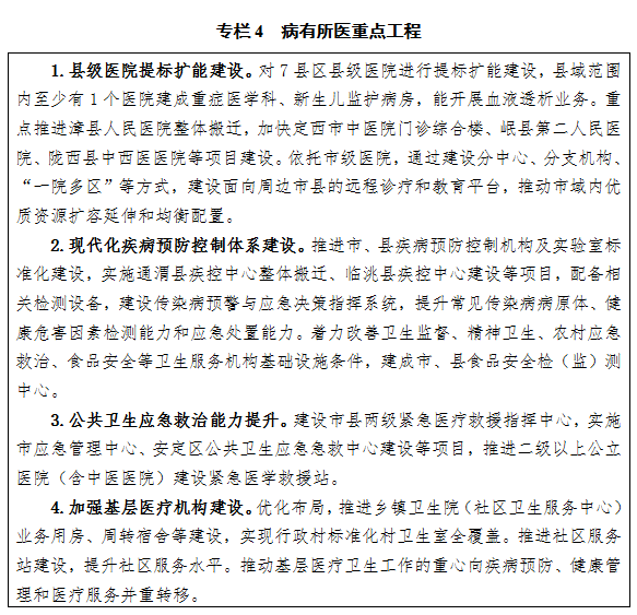 第四节 病有所医 改善农村医疗卫生保障条件,提升县域医疗卫生服务能力。加强妇幼健康服务体系建设,统筹利用各种服务资源,鼓励有条件的妇幼保健机构扩展强化产科、儿科、中医科等服务功能。完善疾病预防控制体系,加强综合性医院传染病区和传染病医院建设,全面提升艾滋病、结核病等重大传染疾病防治能力。建立健全门诊共济保障机制,逐步将门诊医疗费用纳入基本医疗保险统筹基金支付范围,完善城乡居民基本医疗保险门诊统筹,根据国家安排改革职工基本医疗保险个人账户。