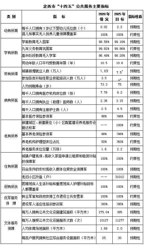 定政办发〔2022〕16号 各县区人民政府,定西高新区、定西生态科创城管委会,市政府有关部门,中央及省属在定有关单位: 《定西市“十四五”公共服务规划》已经市政府同意,现印发你们,请认真组织实施。 (此件公开发布) 定西市人民政府办公室 2022年1月13日 序 言 公共服务关乎民生,连接民心。习近平总书记多次强调,要着力补齐民生短板,破解民生难题,兜牢民生底线,办好就业、教育、社保、医疗、养老、托幼、住房等民生实事,提高公共服务可及性和均等化水平。制定公共服务发展规划,是落实以人民为中心的发展思想、改善人民生活品质的重大举措,是促进社会公平正义、扎实推进共同富裕的应有之义,是促进形成强大国内市场、构建新发展格局的重要内容,对增强全市人民群众获得感、幸福感、安全感,促进人的全面发展和社会全面进步,具有十分重要的意义。 本规划依据《甘肃省“十四五”公共服务规划》及《定西市国民经济和社会发展第十四个五年规划和二〇三五年远景目标纲要》编制。规划期为2021—2025年。本规划主要涵盖幼有所育、学有所教、劳有所得、病有所医、老有所养、住有所居、弱有所扶、优军服务和文体服务九大领域公共服务;根据服务供给权责分类,主要包括基本公共服务和普惠性非基本公共服务两大类,生活服务是其有益补充。