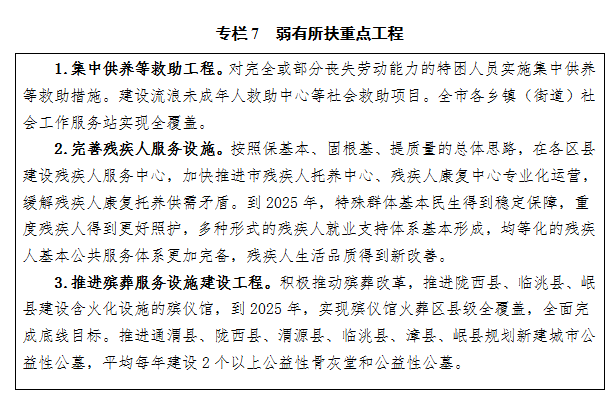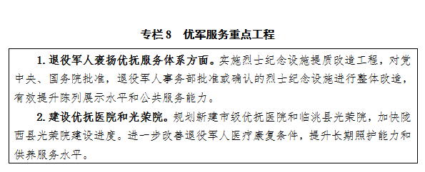 第七节 弱有所扶 健全完善残疾人社会保障和关爱服务体系,加快建立多层次的残疾人社会保障制度、多形式的残疾人就业支撑体系和均等化的残疾人基本公共服务体系。支持困难残疾人家庭无障碍设施改造,动态调整困难残疾人生活补贴和重度残疾人护理补贴标准。支持儿童福利机构建设,提升孤弃儿童集中养育水平。加强留守儿童数量较多的欠发达地区未成年人保护设施建设。充分利用现有社会福利设施建设流浪乞讨人员救助设施或救助站,实现救助服务网络覆盖全部县(区)。进一步规范发展慈善组织、慈善捐赠、慈善信托等活动,加强慈善活动监督,规范慈善组织行为,完善慈善专栏表彰奖励制度,构建现代慈善事业发展新格局。建立健全殡葬服务制度,加强节地生态公益性安葬设施建设,补齐殡仪馆、公益性安葬设备等服务设施短板,逐步构建功能齐全、便民惠民、绿色文明的基本殡葬服务体系。 第八节 优军服务 完善抚恤优待政策,健全优待体系,加大优抚力度,提升优抚保障能力,实施精准帮扶援助,更加注重保障重点优抚对象,推进建设新型优抚保障体系。实行退役军人和其他优抚对象在充分共享、优先落实公民养老、医疗、教育、就业、住房、救助以及残疾人、老年人等方面普惠性公共服务的基础上,再给予相应的抚恤优待。健全退役军人安置机制,规范安置流程,畅通安置渠道,强化安置保障,坚持妥善安置、合理使用、人尽其才、各得其所,全面完成移交安置任务。坚持政府推动、市场导向、自主作为,完善教育培训体系,持续提升退役军人职业能力。落实扶持政策,拓宽就业渠道,大力推进退役军人充分就业。强化创业服务,加大创业优待,积极扶持退役军人创新创业。