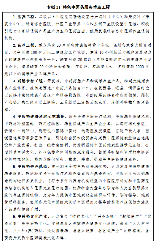 第六节 发展特色中医药服务 坚持“六化”并进,力争把定西打造成陇东南中医药健康旅游示范区、国家中医药产业发展综合试验区核心区和具有国际竞争力的西部大健康产业发展示范区。按照“以医带药、以药促医、医药并举、药医共荣”的原则,构建卫生健康、中医中药、保健养生、药膳食疗、健康养老协同发展的新格局。加强中医药基础理论研究和科技创新,提升中医药科研成果转化效能。推进中药材种养殖规模化、规范化,实施道地药材生态种植及质量保障项目,做大做强“陇药”品牌。促进中医药养生保健、健康养老和旅游等特色服务融合发展。