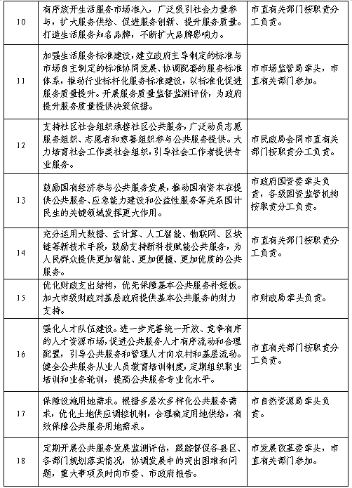 第六章 系统提升公共服务综合供给效能 以满足人民群众多层次多样化需求为目标,围绕公共服务设施布局、生产供给、要素保障等关键环节,坚持科学谋划、改革创新,促进全市公共服务提质增效,提升公共服务体系服务我市发展战略能力。 第一节 科学合理布局公共服务设施 优化公共服务设施布局。统筹服务半径和服务对象数量、年龄等因素,科学布局公共服务设施建设,确保选址贴近服务对象。对幼儿园和小学、社区养老托育设施、卫生站(室)等服务频次高、服务对象活动能力弱的公共服务设施,要适度控制建设规模、合理安排密度,打造居民身边的15分钟服务圈。在人员居住相对分散的偏远农村地区,因地制宜、统筹布局固定服务设施和流动服务设施,确保服务时间和地点相对稳定,保障农村居民享受公平可及便利的公共服务。 合理控制公共服务设施规模。按照功能优先、经济适用、便利可及原则,合理确定建设规模,有序推进公共服务设施建设。对于高频次服务设施,要适度增加布点、控制规模,通过总分馆(院)、连锁等形式共享优质资源。对于服务频次相对较低或服务事项具有较强相关性的公共服务设施,在统筹考虑服务链条通畅的基础上适 度集中布局,结合“最多跑一次”等已有成功经验,简化办理流程。在鼓励应用现代信息技术提高服务便利性的同时,为老年人、残疾人等特殊群体保留必要的现场服务窗口。 推动毗邻县区设施共建共享。鼓励毗邻县区打破行政区划限制,统筹公共服务标准,健全城市公共服务便利共享制度安排和成本共担、利益共享机制,互联互通相关信息数据,共享教育、医疗、养老等优质服务资源和公共服务设施,为城乡居民就近享有公共服务提供便利条件。 第二节 构建公共服务多元供给格局 深化事业单位改革。按照“政事分开、事企分开、管办分离”的思路,优化布局结构,完善制度机制,强化公益属性,提高治理效能,加快推进事业单位改革。紧紧围绕基础性、兜底性、普惠性的公共服务需求,引导事业资源参与公共服务供给。统筹盘活用好沉淀和低效配置的事业编制资源,加大对人口集中流入地区统筹调剂力度,解决义务教育、基本医疗、公共文化等编制急需,加快补齐基本公共服务短板。 鼓励社会力量参与。集中清理在市场准入方面对企业资质、资金、股比、人员、场所等设置的不合理条件,在资格准入、职称评定、土地供给、财力支持、政府采购、监督管理等方面公平对待民办与公办机构,及时清理和废除妨碍公平竞争的各种规定和做法。深化“放管服”改革,加快推进“一窗办、一网办、简化办、马上办”,压减行政审批事项,优化审批流程,规范审批行为。 支持社会组织发展。大力培育发展面向社区居民提供各类公共服务的社区组织。支持社区社会组织承接社区公共服务,开展社区志愿服务。逐步扩大政府向社会组织购买服务的范围和规模,对民生保障、社会治理、行业管理、公益慈善等领域的公共服务项目,同等条件下优先向社会组织购买。大力发展慈善组织,广泛动员志愿服务组织和志愿者参与公共服务提供,鼓励企事业单位提供公益慈善服务。大力培育社会工作类社会组织,引导社会工作者提供专业服务。完善激励保障措施,落实慈善捐赠的相关优惠政策,共同营造社会力量参与公共服务的良好环境。 发挥国有经济作用。鼓励国有经济参与公共服务发展,进一步明确国有经济参与的领域和条件,推动国有资本在提供公共服务、应急能力建设和公益性服务等关系国计民生的关键领域发挥更大作用。更好发挥国有经济在公共服务领域的保障作用,支持国有经济参与的公共服务做大做强,壮大产业集团和品牌经营,重点培育发展一批实力雄厚、具有较强竞争力和影响力的大型社会服务领域企业。鼓励和引导国有经济以兼并、收购、参股、合作、租赁、承包等多种形式参与公共服务,拓宽国有经济进入渠道。 第三节 提高公共服务便利共享水平 科技赋能公共服务。充分运用大数据、云计算、人工智能、物联网、互联网、区块链等新技术手段,为人民群众提供更加智能、更加便捷、更加优质的公共服务。促进“互联网+公共服务”发展,大力培育跨行业跨领域综合性平台和行业垂直平台,开展公共服务在线对接,探索教育、医疗健康、养老、社区、家政、旅游、体育等领域线上线下融合互动的公共服务供给体系。促进人工智能在公共服务领域推广应用,鼓励发展数字创意、智慧医疗、智慧旅游、智慧文化、智慧体育、智慧养老等新产业新业态。探索“区块链+”在公共服务领域运用。坚持传统服务方式与智能化服务创新并行,加快信息无障碍建设,帮助老年人、残疾人等共享数字生活。 推动数据互联互通。探索实施民生档案跨区查档服务项目,建立互认互通的档案专题数据标准体系。推进数字政府建设,强化教育、卫生、社会保障、社会服务等重点领域数据信息交换共享,加快实现民生保障事项“一地受理、一次办理”。加强部门间信息共享和证明互认,通过完善信用监管、全面推进告知承诺制等方式,实施证明事项清单管理制度,推动减少不必要的证明事项。加强地区间的信息互联互通,积极推进残疾人两项补贴资格认定申请“跨省通办”、异地就医结算等便利服务。建立健全政府及公共服务机构
