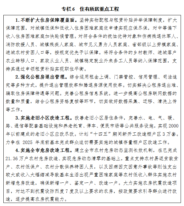 第六节 住有所居 健全完善住房保障和供应体系,加快建立“多主体供给、多渠道保障、租购并举”住房制度,构建以公共租赁住房、保障性租赁住房和和租赁补贴为主体的住房保障体系,解决好城镇住房和收入困难家庭、新市民、青年人,特别是从事基本公共服务人员等住房困难群体住房问题。加快推进城镇老旧小区、棚户区和农村危房改造,持续改善城乡居民住房条件。