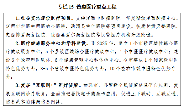 第六节 普惠医疗服务 鼓励社会资本举办医疗卫生机构,在眼科、骨科、口腔、妇产、儿科、肿瘤、精神、医疗美容等专科以及中医、康复、护理、体检等领域打造一批具有竞争力的品牌服务机构,弥补公立医疗机构服务提供不足问题。鼓励有实力的社会办医疗机构组建优势学科团队,提供以先进医疗技术为特色的医疗服务。完善全民健康信息平台,促进健康医疗大数据广泛应用。加快人工智能、第五代移动通信等信息技术在健康服务领域集成应用,推动新型穿戴设备、智能终端等产品研发。发展“互联网+医疗健康”,推广远程医疗服务。每县区建成2-5个省级重点学科、5-8个市级重点学科。逐步实行非营利性民营医院与公立医院享受同等待遇,促进医疗服务市场有序、公平竞争。加强对非公立医疗机构执业行为、经营目的的监管,规范其医疗行为,引导其健康发展。引入第三方投资的健康医学检查、健康保险产品、建设休闲设施等,通过多种方式,提高健康服务保障能力。