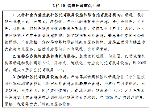 第四章 扩大普惠性非基本公共服务供给 紧紧围绕供需矛盾突出的公共服务领域,发挥政府引导作用,支持社会力量重点加强优质普惠托育、学前教育、高中教育、职业教育、普惠养老、普惠医疗服务的供给力度,面向广大人民群众提供价格可负担、质量有保障的普惠性非基本公共服务。 第一节 普惠托育 促进3岁以下婴幼儿照护托育服务发展,支持社会力量发展社区托育服务设施和综合托育服务机构。围绕“政府引导、多方参与、社会运营、普惠可及” 的原则,深入开展城企合作。鼓励依托幼儿园、妇幼保健机构等新建和改扩建嵌入式、分布式、连锁化、专业化的托育服务设施。在农村社区综合服务设施建设中,统筹考虑婴幼儿照护服务设施建设。加大对农村婴幼儿照护服务的支持。督促指导现有托育机构规范发展,注重扶持和打造婴幼儿托育服务示范试点机构,创造有利条件,鼓励和引导民间资本投资托育服务行业。鼓励职业院校开设托育专业,培养专业托育人才。