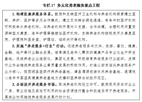 第二节 多元化养老服务 积极发展老年生活照料、老年健康服务、老年体育健身、老年文化娱乐、老年旅游、老年金融服务、老年法律服务等养老服务业,加强残障老年人专业化服务。加快老年人助行器具、视听辅助、营养保健、服装饰品等老年产品研发,推进医疗器械、康复辅具、服务型机器人等涉老制造业快速发展。发展老年用品租赁市场,探索“物业+养老”服务模式,促进各类医养康养新业态发展。落实民办养老机构床位补贴政策,鼓励社会组织、餐饮企业在有条件的农村开办老年餐桌。推进老年人紧急求助、跟踪定位、健康监测等智能产品研发与推广。开展与基本生活密切相关的网站、手机APP的适老化改造,鼓励企业在智能设备上提供“老年模式”“长辈模式”。