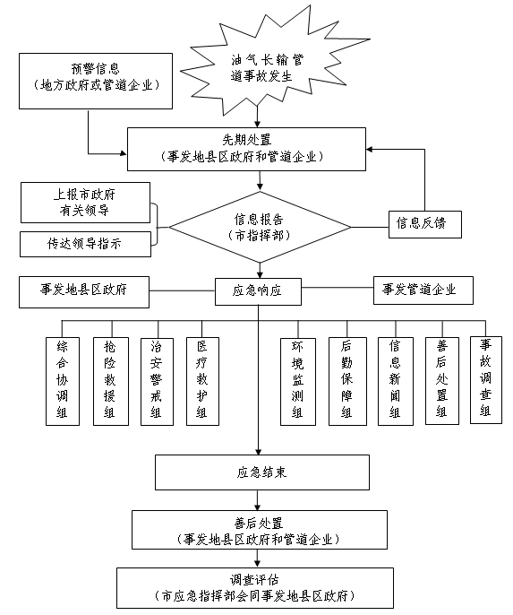 在一般油气长输管道事故处置的基础上,油气管道企业、事发地县区政府相关应急队伍按照各自职责和本单位应急预案进行先期处置,市综合、专业应急救援队伍到达现场后进行协同处置。相关部门、单位根据事故发展趋势做好疏散准备,进行现场清理和环境监测。