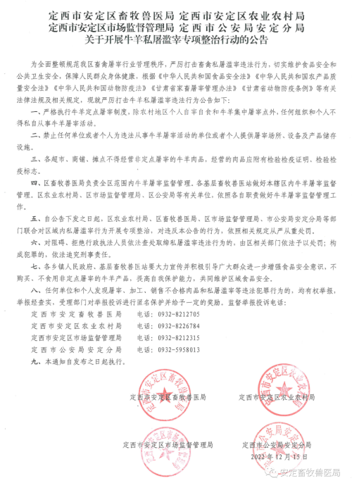 为全面整顿规范我区畜禽屠宰行业管理秩序,严厉打击畜禽私屠滥宰违法行为,切实维护食品安全和公共卫生安全,保障人民群众身体健康,根据《中华人民共和国食品安全法》《中华人民共和国农产品质量安全法》《中华人民共和国动物防疫法》《甘肃省家畜屠宰管理办法》《甘肃省动物防疫条例》等有关法律法规及相关规定,现就严厉打击牛羊私屠滥宰违法行为公告如下: 一、严格执行牛羊定点屠宰制度,除农村地区个人自宰自食和牛羊集中屠宰点外,任何组织和个人不得私自从事牛羊屠宰活动。 二、禁止任何单位或者个人为违法从事牛羊屠宰活动的单位或者个人提供屠宰场所、设备及产品储存设施。 三、各超市、商铺、摊点不得经营非定点屠宰的牛羊肉品,经营的肉品应附有检验检疫证明、检验检疫标志。 四、区畜牧兽医局负责全区范围内牛羊屠宰监督管理。各基层畜牧兽医站做好本辖区内牛羊屠宰监督管理。区农业农村局、区市场监督管理局、区公安局等有关单位,依照各自职责做好牛羊屠宰监督管理工作。 五、自公告下发之日起,区农业农村局、区畜牧兽医局、区市场监督管理局、市公安局安定分局等部门联合对区域内私屠滥宰行为开展专项整治,对违反本公告的行为,依照相关规定从严从重处罚。 六、对阻碍、拒绝行政执法人员依法查处取缔私屠滥宰违法行为的,由区相关部门依法予以处罚;构成犯罪的,依法追究刑事责任。 七、各乡镇人民政府、基层畜牧兽医站要大力宣传并积极引导广大群众进一步增强食品安全意识,不购买、不食用非定点屠宰的牛羊产品,提高自我保护能力,共同维护区域食品安全。 八、任何单位和个人发现屠宰、加工、销售不合格肉品和私屠滥宰等违法犯罪行为的,均有权举报,举报经查实,受理部门对举报投诉进行匿名保护并给予一定的奖励。监督举报投诉电话: 定西市安定畜牧兽医局 电话:0932-8212705 定西市安定区农业农村局 电话:0932-8226784 定西市安定区市场监督管理局 电话:0932-8212315 定西市公安局安定分局 电话:0932-5958013 九、本通知自发布之日起执行。