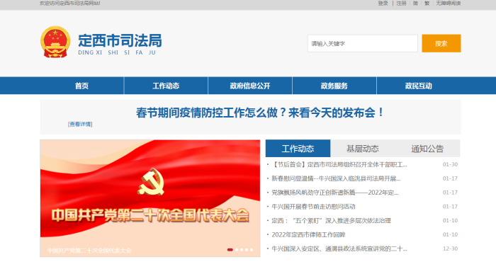 (三)加强网媒建设,发挥平台作用。强化门户网站和政务新媒体建设,持续完善以定西市司法局门户网站、定西市政务公开平台市司法局子平台为主体,以“定西法治宣传”微信公众号、“定西司法”今日头条号、抖音号,局机关政务公示栏为补充的“线上线下”相结合的政府信息公开体系,切实保障司法行政领域政府信息公开成效明显,持续提升群众满意度和知晓率。2022年官方网站发布信息401篇,访问量14万人次,微信公众号发布信息2458篇,阅读量为300万人次,抖音号发布700条视频,阅读量2.5亿人次,今日头条发布文章视频1100条,阅读量1100万人次。 二、主动公开政府信息情况