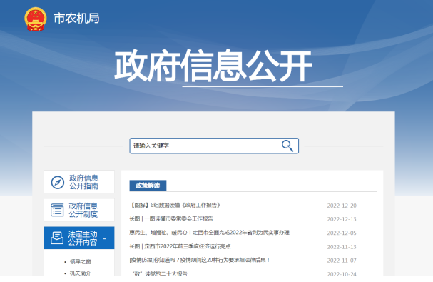 根据《中华人民共和国政府信息公开条例》要求,现发布《定西市农机中心2022年政府信息公开工作年度报告》。本报告由总体情况、主动公开政府信息情况、收到和处理政府信息公开申请情况、政府信息公开行政复议行政诉讼情况、存在的主要问题及改进情况、其他需要报告的事项等六部分组成。报告中所列数据统计期限为2022年1月1日到12月31日。 一、总体情况 2022年,在市委、市政府的正确领导下,我中心认真执行《中华人民共和国政府信息公开工作年度报告格式》要求,以习近平新时代中国特色社会主义思想为指导,全面贯彻落实党的二十大精神,紧紧围绕农机化重点工作,坚持应公开尽公开的原则,认真做好政府信息公开工作。 (一)信息公开情况。2022年在定西政务公开平台公布领导之窗、机构简介、部门文件、政策解读、公示公告、预算决算等信息61条。在定西市农业机械化服务中心门户网站公开工作动态、行政通知、农机管理、农机培训、农机推广、普法专栏、购机补贴信息公开专栏、党的建设、农机化技术线上服务站等信息453条。