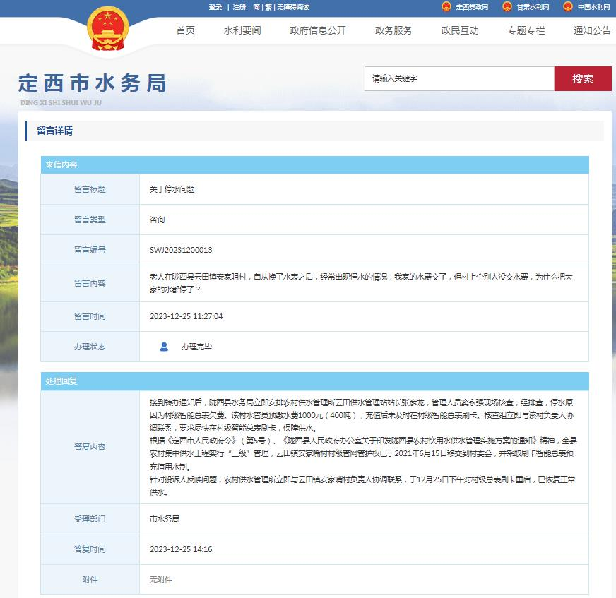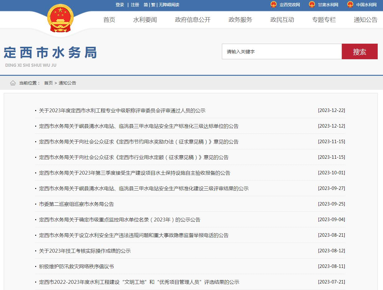 定西市水务局2023年政府信息公开工作年度报告 |
