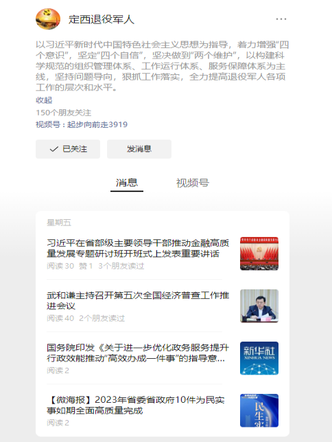 (四)政府信息公开平台建设 建立“定西退役军人”政务新媒体公众号。由局办公室负责信息收集、整理、上传和更新等工作,制定信息发布三级审核制度,发布政策解读信息、重点工作推进情况等内容。同时积极回应与群众切身利益密切相关的热点问题,做好舆论引导工作,切实维护好政府公信力。2023年在公众号发布信息1194条。