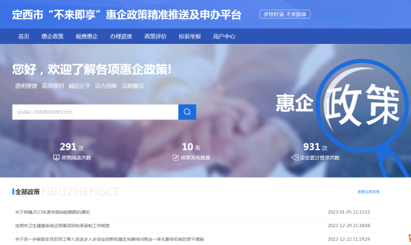 二是积极推进重点工作。聚焦今年重点政务公开内容,市政管局将重点领域、重点改革开展情况全过程全方位置于监督之下,切实保障群众知情权、参与权、表达权和监督权。利用定西党政网、一体化政务服务平台、定西电视台、定西日报和定西市政管局微信公众号等平台,围绕重点工作领域,以专题解读、专栏等多种形式,发布《定西市行政许可事项清单(2023年版)》等文件,对重大政策文件解读10多次,媒体评论文章转载40多篇。高标准建成“7×24”小时在线、集咨询投诉、信息智能为一体的12345政务服务便民热线平台,上线以来共受理各类民生事项47.50万件,日均受理694件,转各县区和市直单位办理16.11万件。截至目前,事项办结率100%,按时办结率99.2%,双满意率96.10%。网上可办率和全程网办率持续攀升,全市依申请行政权力和公共服务(除主动服务)事项60350项,网上可办事项59871项,网上可办率99.63%,全程网办率99.25%。全市行政许可事项承诺办理时限在法定时限基础上压减达到82.58%。依托自建“不来即享”惠企平台,充实市场主体数据库,运用大数据功能,快速匹配相关行业企业,实现最新税收政策、企业减税降费红利、企业税收风险提醒、企业个性化服务等的精准推送,已向2.1万户企业发送税费优惠政策26.2万余条,推送减税降费幸福账单6.2万份。充分利用定西市政务服务微信公众号发布数字政府建设情况、“放管服”改革、社会保障、人事招聘、政务服务、热点事件等事项,截至目前,共发布各类信息180余条。