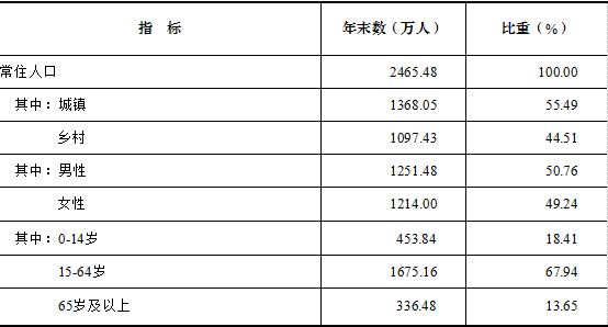 甘肃省统计局 国家统计局甘肃调查总队 (2024年3月14日) 2023年,在省委、省政府的坚强领导下,全省上下坚持以习近平新时代中国特色社会主义思想为指导,深入贯彻党的二十大精神,坚持稳中求进工作总基调,完整准确全面贯彻新发展理念,深入实施“四强”行动,做深做细“五量”文章,全力以赴抓经济,千方百计促发展,全省经济稳中向好、进中提质,质量效益持续提升,民生保障有力有效,高质量发展扎实推进,中国式现代化甘肃实践迈出坚实步伐。 一、综合 初步核算,全年全省地区生产总值11863.8亿元,比上年增长6.4%。其中,第一产业增加值1641.3亿元,增长5.9%;第二产业增加值4080.8亿元,增长6.5%;第三产业增加值6141.8亿元,增长6.4%。第一产业增加值占地区生产总值比重为13.8%,第二产业增加值比重为34.4%,第三产业增加值比重为51.8%。按常住人口计算,全年人均地区生产总值47867元,比上年增长6.9%。 全年全省十大生态产业增加值3882.96亿元,占全省地区生产总值的32.7%。 年末全省常住人口2465.48万人,比上年末减少26.94万人。其中,城镇人口1368.05万人,占常住人口比重(常住人口城镇化率)为55.49%,比上年末提高1.3个百分点。全年出生人口19.10万人,出生率为7.71‰;死亡人口22.40万人,死亡率为9.04‰;人口自然增长率为-1.33‰。 表1 2023年甘肃省年末人口数及其构成