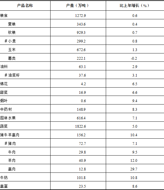 二、农业 全年全省粮食种植面积271.1万公顷,比上年增加1.1万公顷。其中,小麦种植面积74.0万公顷,增加0.1万公顷;玉米种植面积109.9万公顷,增加2.5万公顷;马铃薯种植面积56.9万公顷,减少0.8万公顷。蔬菜种植面积48.6万公顷,增加3.2万公顷。中药材种植面积31.7万公顷,增加1.8万公顷。果园面积33.1万公顷,减少0.1万公顷。油料种植面积27.8万公顷,增加0.8万公顷。 全年粮食产量1272.9万吨,比上年增产0.6%。其中,夏粮产量343.6万吨,增产0.4%;秋粮产量929.3万吨,增产0.7%。 全年蔬菜产量1822.6万吨,比上年增产5.0%。中药材产量148.9万吨,增产8.3%。园林水果产量616.4万吨,增产7.1%。 全年猪牛羊禽肉产量156.2万吨,比上年增长10.4%。牛奶产量101.8万吨,增长10.8%。年末牛存栏558.9万头,增长5.1%;牛出栏261.4万头,增长5.5%。羊存栏2805.8万只,增长8.1%;羊出栏2558.2万只,增长12.3%。生猪存栏696.0万头,下降0.5%;生猪出栏958.6万头,增长7.0%。 表3 2023年甘肃省主要农产品产量及其增长速度