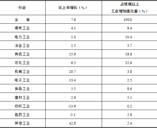 三、工业和建筑业 全年全省全部工业增加值3389.6亿元,比上年增长6.8%。规模以上工业增加值增长7.6%。在规模以上工业中,分经济类型看,国有及国有控股企业增加值增长7.0%;集体企业下降10.0%,股份制企业增长4.8%,外商及港澳台投资企业增长6.0%;私营企业增长11.6%。分隶属关系看,中央企业增加值增长5.9%,省属企业增长10.2%,省以下地方企业增长8.8%。分轻重工业看,轻工业增加值增长4.0%,重工业增长8.1%。分门类看,采矿业增加值增长4.4%,制造业增长9.4%,电力、热力、燃气及水生产和供应业增长5.9%。 表4 2023年甘肃省规模以上工业分行业增加值增长速度及其比重
