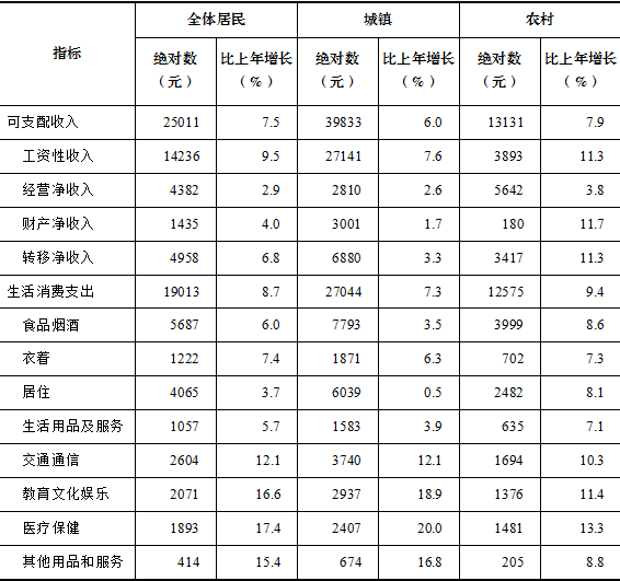 八、居民收入消费和社会保障 全年全省居民人均可支配收入25011元,比上年增长7.5%。按常住地分,城镇居民人均可支配收入39833元,增长6.0%;农村居民人均可支配收入13131元,增长7.9%。城乡居民人均可支配收入比值为3.03,比上年缩小0.06。 全年全省居民人均消费支出19013元,比上年增长8.7%。按常住地分,城镇居民人均消费支出27044元,增长7.3%;农村居民人均消费支出12575元,增长9.4%。全省居民恩格尔系数为29.9%,其中城镇为28.8%,农村为31.8%。 表10 2023年甘肃省城乡居民家庭人均收支情况