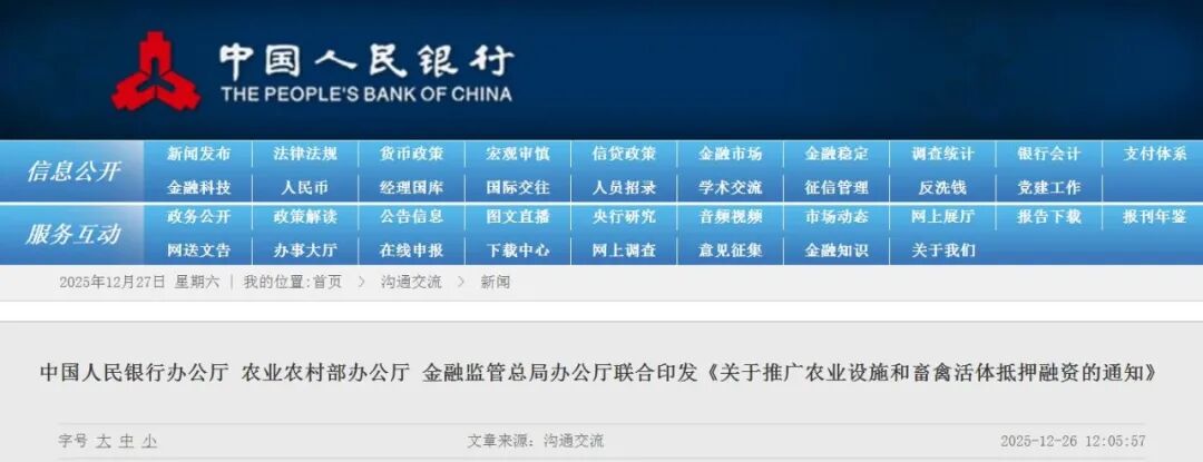 近日,中国人民银行办公厅、农业农村部办公厅、金融监管总局办公厅联合印发《关于推广农业设施和畜禽活体抵押融资的通知》(以下简称《通知》),旨在创新乡村振兴投融资机制,拓宽农业农村抵质押物范围,盘活农村资源要素,助力推进乡村全面振兴。 《通知》提出,要高度重视农业设施和畜禽活体抵押融资工作,聚焦投资价值高、示范带动作用强的农业设施以及权属清晰的畜禽活体开展抵押融资,逐步建立规范管理制度,健全风险防范化解机制。规范农业设施和畜禽活体确权登记,建立健全申报、调查、核实、公示等工作流程,推广电子耳标、生物识别等数字化技术应用。科学评估农业设施和畜禽活体价值,鼓励有条件的地方建立评估机构、人员配备等配套管理制度。 《通知》强调,要完善农业设施和畜禽活体抵押登记模式,因地制宜建立抵押物清单名录,鼓励通过中国人民银行征信中心动产融资统一登记公示系统规范开展登记、查询。支持有条件的地区建设农业设施和畜禽活体抵押数字化管理平台,赋予抵押资产专属“二维码”。鼓励金融机构创新金融产品和服务方式,探索“农业保险+融资”模式,用好信贷市场服务平台,加强信息共享与融资对接服务。建立健全信贷风险分担和监测机制,探索创新担保服务路径,扩大保险覆盖范围,支持通过物联网平台等智能化手段,加强在押资产管理。 中国人民银行办公厅 农业农村部办公厅 金融监管总局办公厅关于推广农业设施和畜禽活体抵押融资的通知 为深入贯彻落实党的二十大和二十届二中、三中、四中全会精神,按照《中共中央国务院关于进一步深化农村改革扎实推进乡村全面振兴的意见》要求,中国人民银行、农业农村部、金融监管总局决定推广农业设施和畜禽活体抵押融资,进一步完善管理制度,创新服务机制,推动盘活农村资源要素,引导扩大有效投资,满足农业经营主体多层次、多样化的融资需求。现将有关要求通知如下。 一、高度重视农业设施和畜禽活体抵押融资工作 (一)充分认识重要意义。农业设施和畜禽活体是农业经营主体的重要资产,价值开发空间巨大。推广农业设施和畜禽活体抵押融资,有助于盘活农村产权资源,拓宽农村融资抵押物范围,对于提高农业经营主体融资可得性和便利性、促进农业农村现代化具有重要意义。 (二)突出业务推进重点。各地要围绕《全国现代设施农业建设规划(2023—2030年)》提出的现代设施建设六个重大工程,聚焦投资价值高、示范带动作用强的农业设施以及权属清晰的畜禽活体,优先选择在大中城市周边、设施农业集聚区和畜禽养殖大县等地区,引导有较强运营实力的新型农业经营主体和大中型农业企业开展农业设施和畜禽活体抵押融资,逐步建立规范管理制度,完善融资产品服务,健全风险防范化解机制,引导撬动金融资源和社会资本加大投入,助力乡村全面振兴。 二、规范农业设施和畜禽活体确权登记 (三)完善农业设施确权登记制度。各地农业农村部门要会同有关部门制定符合当地实际的农业设施确权登记管理办法,明确确权登记管理机构,建立完善申报、调查、核实、公示等工作流程,依法对农业设施所有权权属清晰、项目规划和用地符合管理要求、具备一定规模和较高价值的农业设施办理所有权登记备案,制发产权证。 (四)推广畜禽活体差异化确权方式。各地农业农村部门要积极推广电子耳标、生物识别等数字化技术应用,根据畜禽活体的不同生物特征,探索赋予畜禽活体电子动态档案、数字身份标识等差异化确权方式,实现确权过程的精准性与可追溯性。 (五)提升确权登记服务水平。鼓励有条件的地方设立确权颁证审核窗口,提升农业设施和畜禽活体确权登记服务水平。充分发挥农村基层组织在登记申报、确权颁证等工作中的重要作用,调动广大农民群众参与积极性。 三、科学评估农业设施和畜禽活体价值 (六)探索构建价值评估体系。金融机构可借鉴商业地产、土地资产、工业厂房等资产价值评估经验,或依托第三方专业机构,依据购销合同、往来票据、税费证明、涉农补贴补助以及历史交易平均价格等多维信息,探索通过大数据建模分析,综合采取市价法、成本法或收益法等方式,构建符合农业设施和畜禽活体生产使用特点的标准化价值评估体系。 (七)建立价值评估配套管理制度。鼓励有条件的地方探索建立针对农业设施和畜禽活体的评估机构资质、人员等配套管理制度。各地农业农村部门应提供必要的信息数据和产业政策支撑,加强与各类行业协会、专业学会及第三方服务机构合作,为农业设施和畜禽活体的合理估值提供有效支撑。 四、完善农业设施和畜禽活体抵押登记模式 (八)建立抵押物清单名录。各地农业农村部门组织制定农业设施和畜禽活体抵押物推荐清单,因地制宜明确本地区可用于融资抵押的设施类型、生物资产种类、建设规模、生产标准、市场价值范围等。金融机构根据自身业务开展情况和风险控制能力,将清单内符合条件的农业设施和畜禽活体纳入抵押物名录。 (九)落实抵押登记公示和贷前审查要求。借款人向金融机构提出贷款申请,对提供资料内容的真实性、完整性和合法性负责。金融机构开展农业设施和畜禽活体抵押贷款业务,要深入细致做好贷前尽职调查,鼓励通过中国人民银行征信中心动产融