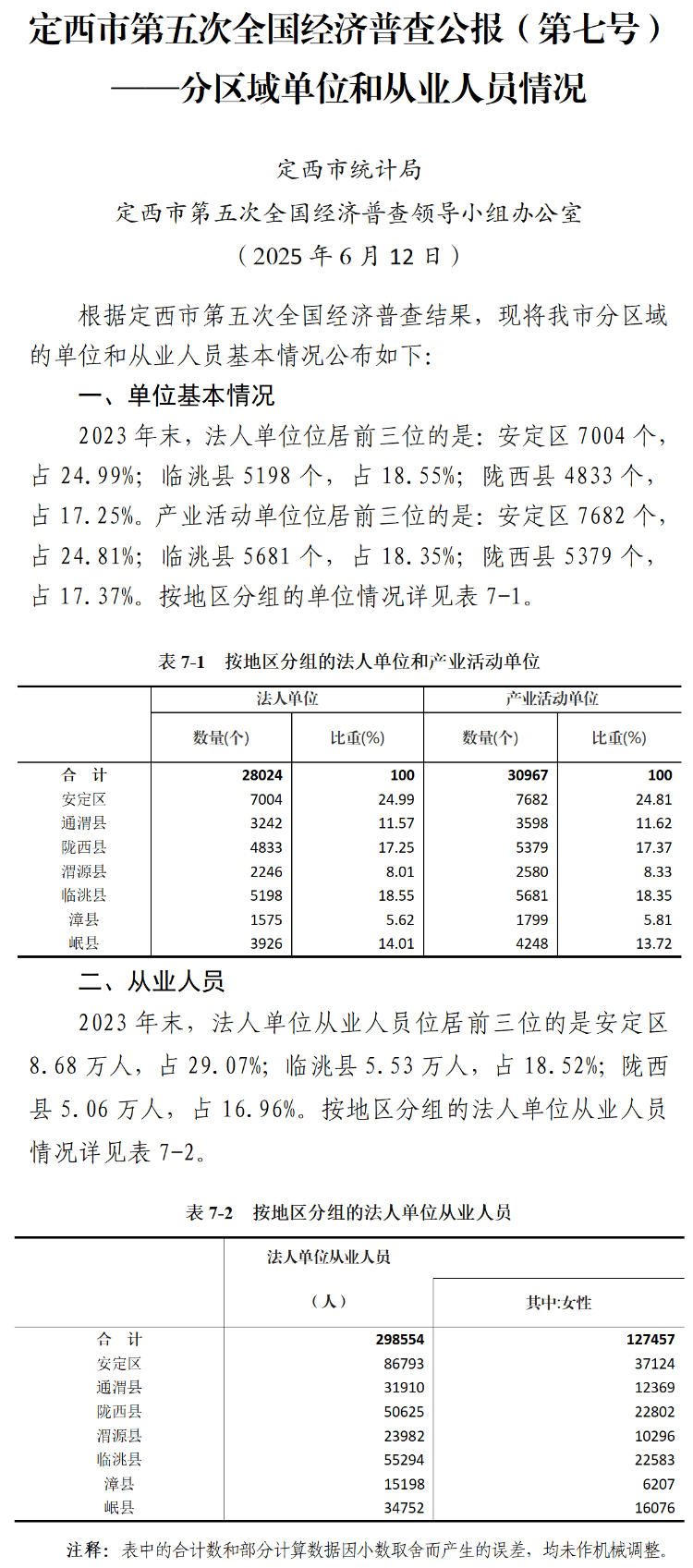 定西市第五次全国经济普查公报(第七号)──分区域单位和从业人员情况