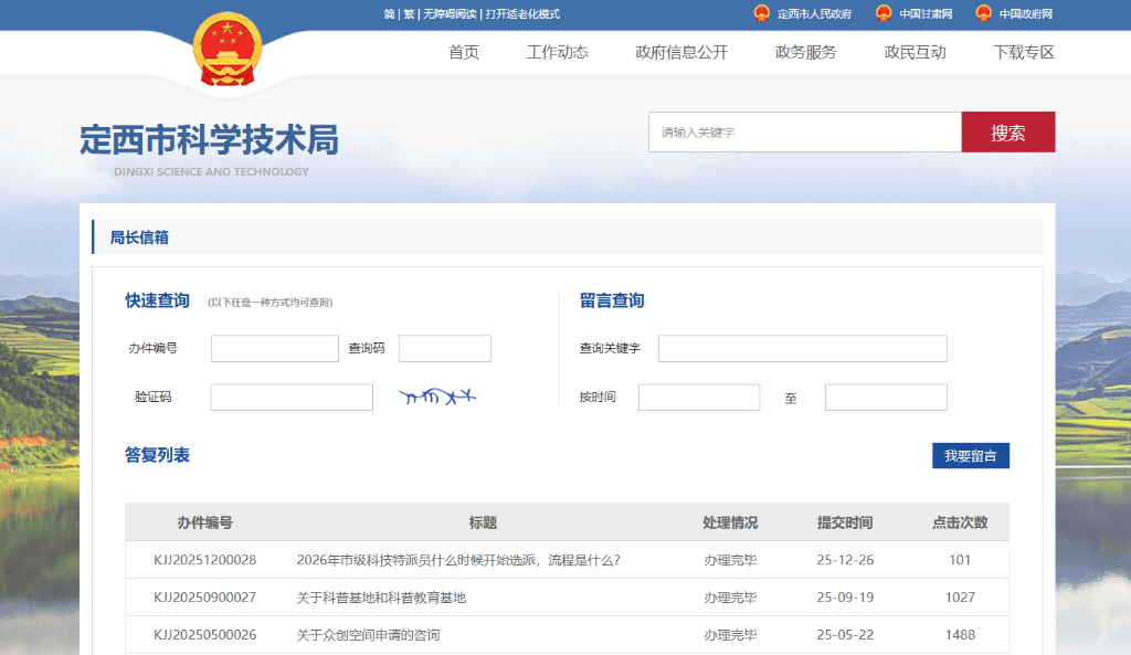 (三)加大平台建设,完善政务公开载体。结合市政府部门网站集约化建设,进一步健全完善定西市科技局门户网站,动态更新“政策法规”“科技动态”“公告公示”等栏目内容,全年处理领导信箱留言3件,办结率和满意度均达100%。依托“定西科技”微信公众号等新媒体平台,发布科技创新政策、项目申报等信息,年度累计公开政务信息700余条。安排专人负责网站运维,实现信息快速采集、审核、发布闭环管理,保障群众知情权、监督权。