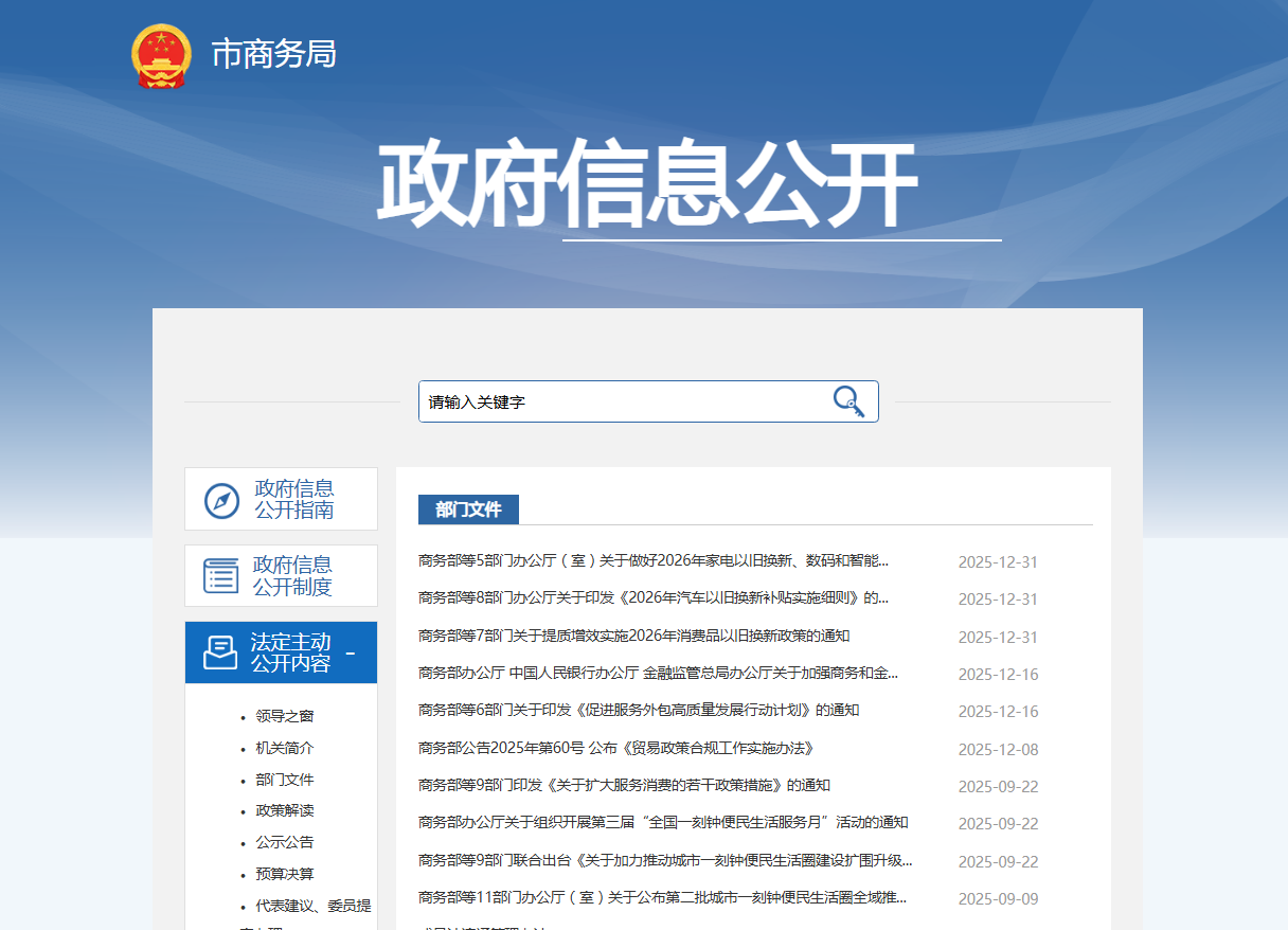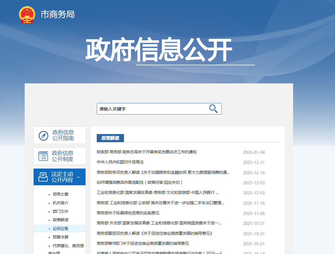 一、总体情况 2025年,市商务局坚持以习近平新时代中国特色社会主义思想为指导,认真贯彻落实中央和省市部署要求,积极健全信息公开工作机制,及时调整政府信息公开领导小组人员,明确政府信息公开的工作任务、公开内容和具体要求,有效保障政府信息公开工作的顺利开展。积极落实信息发布审核制度和保密审查制度,确保发布内容准确性和时效性。加强干部职工保密工作的宣传和教育,保证“上网信息不涉密、涉密信息不上网”。持续紧盯招商引资、外资外贸、社会消费等商务重点工作和消费品以旧换新等社会热点,强化信息发布和政策解读,政府信息公开工作水平得到进一步提升。2025年公开政策解读、通知公告等信息705条。