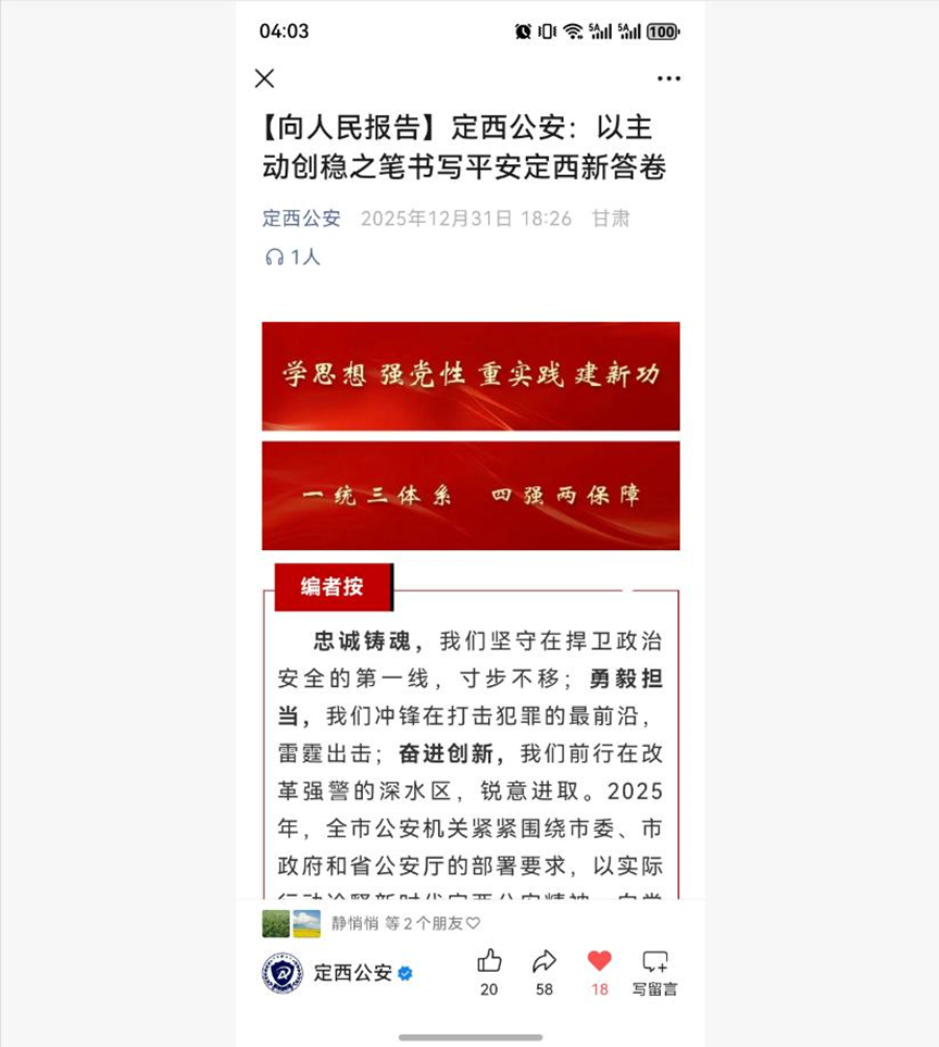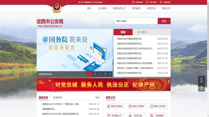 公众号 通过转发国家部委、省公安厅相关政策解读13篇,做好领导信箱、政务互动、民生平台等群众诉求回应工作,按照办理时限,年内共回应领导信箱办理29条,答复率及满意率为100%,民生平台56条,全部按时办结。发布2025年财务预算公开8条。主办人大建议0条,政协提案6条。2025年围绕保护市场主体、优化营商环境、升级政务服务等,持续深化“互联网+公安政务”和“网上办”“掌上办”等便民服务举措,“全程网办”稳步推进,189项公安政务服务事项实现网上办理,“一窗通办”有序推进,为民服务水平大幅度提升,群众企业获得感、幸福感、安全感更加充实、更加保障、更可持续。 1.新闻发布会。定西市公安局累计召开新闻发布会1场,召开打击整治农村赌博违法犯罪“清风2025”专项行动新闻发布会,通报全市公安机关专项行动情况,解读重要政策文件。