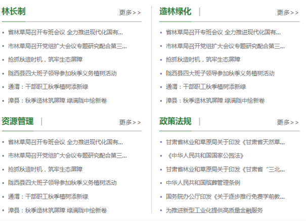 图1(政务公开版块) (二)规范公开平台建设。结合全市林草工作实际,我局及时调整了栏目版块,设置“林长制”“造林绿化”“资源管理”“政策法规”四个版块,使栏目设置更科学,公开范围更全面,进一步强化了定西市林草局门户网站信息公开的第一平台作用,推动了网站建设正规化水平。
