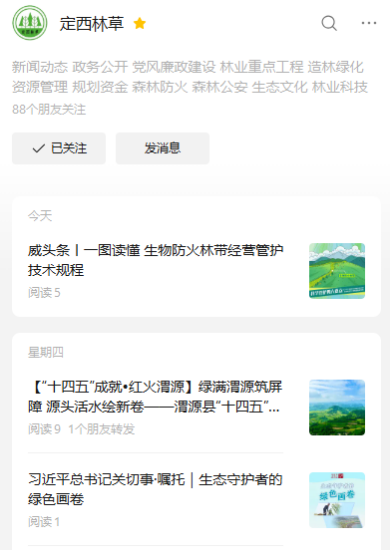 图2(版块设置情况) (三)持续推进信息公开。随着社会公众对政府信息公开参与关注度不断提高,为切实推进市林草局的政府信息公开工作,我局制定下发了《定西市林业和草原局2025年政务公开工作要点》。结合当前的林草重点工作,对局机关做好政务公开工作提出具体要求,按照《政府信息公开专栏更新维护分工表》,对各科室站队(中心)做好政务公开的责任分工进行了细化明确。 (四)拓展信息公开渠道。一是构建多样化渠道。为进一步满足公众获取的需求,我局通过门户网站、报刊杂志等多种渠道,广泛开展政策宣传,增强公开效果。二是发挥微信等新媒体作用。我局专门设立“定西林草”微信公众号,及时发布各类信息,完善互动服务功能,充分发挥政策宣传、舆论引导、回应关切等功能,进一步扩大影响力。三是加强人员培训。为切实做好政务公开工作,我局对工作人员进行政务公开工作培训。通过培训,进一步深化了公开理念,增强了工作主动性,有效促进了我局的政务公开工作。