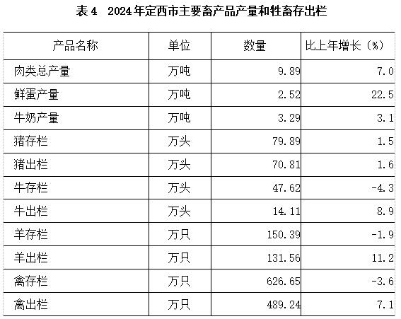 年末大牲畜存栏54.8万头,比上年下降4.0%。猪、牛、羊、家禽存栏分别为79.9万头、47.6万头、150.4万只和626.6 万只,出栏分别为70.8万头、14.1万头、131.6万只和489.2 万只。肉类总产量9.9万吨,增长7%;鲜蛋产量2.5万吨,增长22.5%;牛奶产量3.3万吨,增长3.1%。