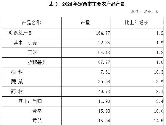 全年新增城镇就业16472人。全市共输转城乡劳动力62.2万人,实现劳务收入188.62亿元,比上年增加10.24亿元,增长5.7%;人均劳务收入30325元,比上年增加1633元。 全年居民消费价格比上年增长0.2%。其中,其他用品和服务类上涨2.7%,衣着类上涨1.9%,生活用品及服务类上涨1.8%,医疗保健类上涨0.6%,教育文化和娱乐类上涨0.1%,食品烟酒类上涨0.1%,交通和通信类下降0.4%,居住类下降0.6%。 二、农业 全年种植各类农作物876.9万亩,比上年增长1.8%。其中,粮食作物603.7万亩,下降0.1%;经济作物273.2万亩,增长6.5%。粮食作物中夏粮149.7万亩,秋粮454万亩。马铃薯、中药材、蔬菜三大特色优势产业种植面积分别达到263.7万亩、162.2万亩、57.9万亩,分别比上年增长0.1%、7.7%、6.5%。 全年粮食总产量164.8万吨,比上年增加1.9万吨,增长1.2%。其中,夏粮31.7万吨,秋粮133.1万吨。