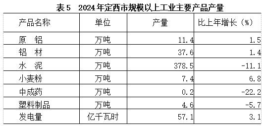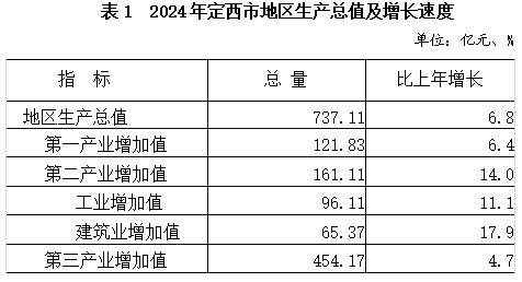 定西市统计局 国家统计局定西调查队 2024年,在市委市政府的坚强领导下,全市上下深入学习贯彻党的二十大和二十届二中、三中全会精神和习近平总书记视察甘肃重要讲话重要指示精神,锚定建设“一区三地”发展定位,深入开展“五比五看”行动,改革创新,锐意进取,攻坚克难,勠力奋进,全市经济运行稳中有进,进中向好,社会发展和谐稳定。 一、综 合 初步核算,2024年全市实现地区生产总值737.11亿元,按不变价格计算,比上年增长6.8%。其中,第一、二、三产业增加值分别为121.83、161.11、454.17亿元,分别比上年增长6.4%、14%、4.7%。三次产业结构比为16.5:21.9:61.6,对经济增长的贡献率分别为16.5%、39.1%、44.4%。按常住人口计算,人均地区生产总值29744元,比上年增长7.4%。