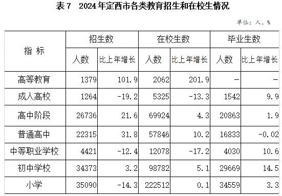 全年落实义务教育保障经费62.2亿元。其中,义务教育公用经费3.58亿元,家庭经济困难学生生活补助2.6亿元,营养改善计划专项资金1.57亿元。为19.29万人次农村义务教育阶段家庭贫困寄宿生补助了生活费,为64.6万名学生发放了免费教科书,为17.4万名农村中小学生提供了营养餐。落实学前教育免(补)保教费资金0.83亿元,下达普惠性民办幼儿园奖补资金1006万元。 十、文化旅游、卫生健康和体育 全年实施文化旅游产业项目33个,完成投资18亿元。全年接待国内外游客2461.39万人次,比上年增长47.8%。旅游花费141.66亿元,增长84.4%。旅游人均花费575.53元,增加115元。 年末艺术表演团体8个,公共图书馆8个,公共博物馆8个,文化馆8个。乡镇综合文化站122个,农家书屋1897个,城市智慧书屋16座,建成村级综合性文化服务中心(乡村舞台)1887个。出版各类报纸1102.91万份,各类期刊(内部)2.7万册。有线数字电视实际用户67128户。年末广播节目综合人口覆盖率为99.44%,电视节目综合人口覆盖率为99.27%。 年末全市共有医疗卫生机构2819个。其中医院68个,医院中综合医院29个,中医类医院25个,专科医院13个,民族医院1个;基层医疗卫生机构2730个,其中,社区卫生服务中心(站)39个,卫生院127个,村卫生室1966个;专业公共卫生机构21个,其中,疾病预防控制中心8个,妇幼保健院(所、站)8个,采供血机构4个。年末卫生技术人员21781人。其中,执业医师和执业助理医师8588人,注册护士9186人。医疗卫生机构床位21919张。其中,医院15598张,卫生院4975张。全年总诊疗人次1039.37万人次。 全年公共体育场地面积620.53万平方米,人均公共体育场地面积2.5平方米,比上年增加0.12平方米。全年省级青少年锦标赛中获得奖牌 100枚。其中金牌31 枚、银牌36枚、铜牌33枚。 十一、资源、环境保护和安全生产 初步测算全市全年自产水资源总量10.14亿立方米,人均水资源量410立方米。全年总用水量32144.53万立方米,比上年下降2.3%。其中生活用水量7330.65万立方米,下降7.8%;工业用水量1407.83万立方米,增长1.8%;农业用水量22688.84万立方米,下降0.6%;生态用水量717.21万立方米,下降2.7%。人均用水量129.92立方米,下降2.0%。 年内完成造林封育3.56万公顷。其中,重点项目人工造林1466.74公顷,封山育林7700.39公顷,退化林分修复19460.97公顷,其他造林7013.68公顷。全市林地总面积41.91万公顷,占国土总面积的21.4%,森林面积25.14万公顷,森林蓄积量689万立方米,草地面积43.68万公顷,草原综合植被覆盖度达79.5%。各类湿地资源2.44万公顷。森林覆盖率12.4%。全市有漳县贵清山、岷县双燕、陇西仁寿山、岷县水生生物四个省级自然保护区和漳县珍稀水生生物一个国家级自然保护区。 全年市区空气质量优良天数比率94.5%,比上年上升0.8个百分点;剔除输入性沙尘天气后,可吸入颗粒物(PM10)年均浓度52.6ug/m3,细颗粒物(PM2.5)年均浓度29.4ug/m3,二氧化硫年均浓度13ug/m3,二氧化氮年均浓度30ug/m3。市内监测的七个县区中,城市区域声环境评价(昼间)总体较好,四个县区区域声环境质量等级二级。市区昼间区域环境噪声平均值53.6分贝,交通噪声昼间加权声级平均值65.2分贝。地表水国考省考断面水质达标率100%,县级以上城市饮用水水源地水质达标率100%。市内12个地表水监测断面中,达到或优于Ⅲ类断面比例为91.7%。 全年共发生各类生产安全事故24起,比上年下降4%;死亡19人,下降9.5%;受伤18人,下降25%。直接经济损失565.59万元,下降2.1%。未发生较大以上生产安全事故。亿元GDP生产安全事故死亡率0.0257。 注释: 1.本公报各项统计数据为初步统计数,正式数据以《定西统计年鉴2025》为准。 2.地区生产总值、三次产业及相关行业增加值绝对数按现价计算,增长或下降速度按不变价计算(2020年不变价)。 3.固定资产投资包括计划投资500万元及以上项目投资和房地产开发投资两部分。 4.资料来源:本公报中城镇新增就业人数、社会保障数据来自市人力资源和社会保障局;医疗保险、生育保险数据来自市医疗保障局;城乡低保、特困人员救助供养、社会服务数据来自市民政局;财政数据来自市财政局;货币金融数据来自中国人民银行定西中心支行;保险数据来自市保险协会;进出口数据来自市商务局;交通运输数据来自市交通运输局;通信数据来自市工信局;邮政数据来自市邮政管理局;教育数据来自市教育局;科技数据来自市科学技术局;专利数据来自市市场监督管理局;文广、旅游、体育数据来自市文体广电和旅游局;卫生数据来自市卫生健康委员会;水资源数据来自市水务局;林业数据来自市林业和草原局;环境监测数据来自市生态环境局;安全生产数据来自市应急管理局。 |