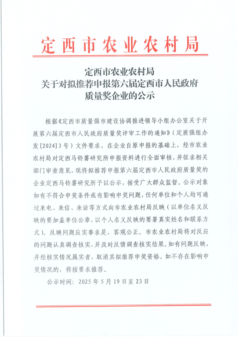 定西市农业农村局关于对拟推荐申报第六届定西市人民政府质量奖企业的公示